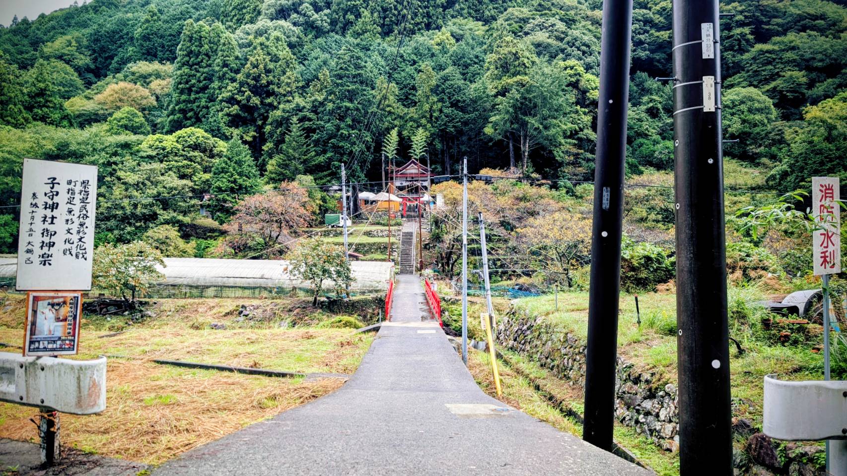 右手に見える赤い橋を渡った先に、「大鍋子守神社」があります。